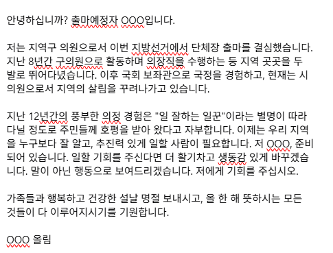 안녕하십니까, OOO입니다. 민족의 명절 설날을 맞아 가족의 온기 속에서 재충전하는 뜻깊은 시간 보내시기 바랍니다. 지난 한 해 묵묵히 최선을 다해주신 여러분의 노고에 깊은 존경을 표하며, 새해에는 붉은 말의 기운처럼 힘차게 도약하는 영광스러운 한 해 되시길 응원하겠습니다. 여러분의 일터와 삶터마다 더 큰 희망이 샘솟기를 진심으로 기원합니다. 2026년 새해 복 많이 받으십시오. 감사합니다. OOO 올림 https://election.munja119.com/https://blog.naver.com/munja119sehttps://kr.pinterest.com/munja119/https://twitter.com/munja119https://www.facebook.com/munja119https://www...