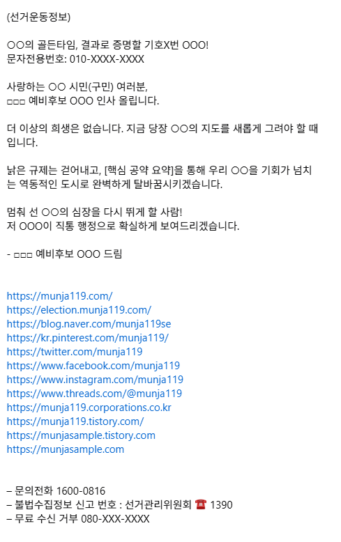 (선거운동정보) ○○의 위기를 기회로! 현장 일꾼 OOO의 □□□ 출마선언 사랑하는 ○○ 가족 여러분, 안녕하십니까. 말이 아닌 실천으로, 약속이 아닌 성과로 증명해 온 OOO입니다. 현재 우리 ○○은 [지역 당면 과제, 예: 인구 감소, 원도심 활력 저하]라는 중대한 위기 앞에 서 있습니다. 우리는 더 이상 기다릴 수 없습니다. 늘 현장에서 답을 찾아온 저 OOO이 ○○의 대전환을 이끌겠습니다. [OOO의 3대 핵심 약속] ▶ 첫째, 소상공인을 살리는 '경제 활력 ○○' ▶ 둘째, 청년·부모·어르신 모두가 평등한 '사람 중심 ○○' ▶ 셋째, 갈등을 넘어 힘을 모으는 '통합과 화합의 ○○' 보여주기식 행정은 하지 않겠습니다. 구민의 삶을 바꾸는 확실한 결과로 평가받겠습니다. ○○의 새로운 길, 저 OO..